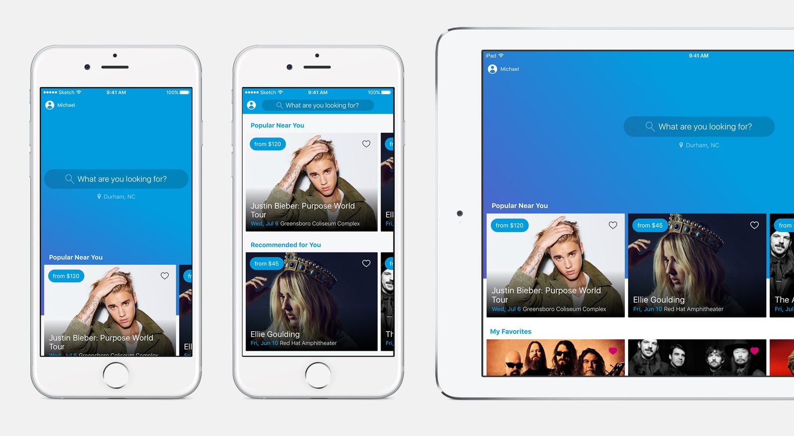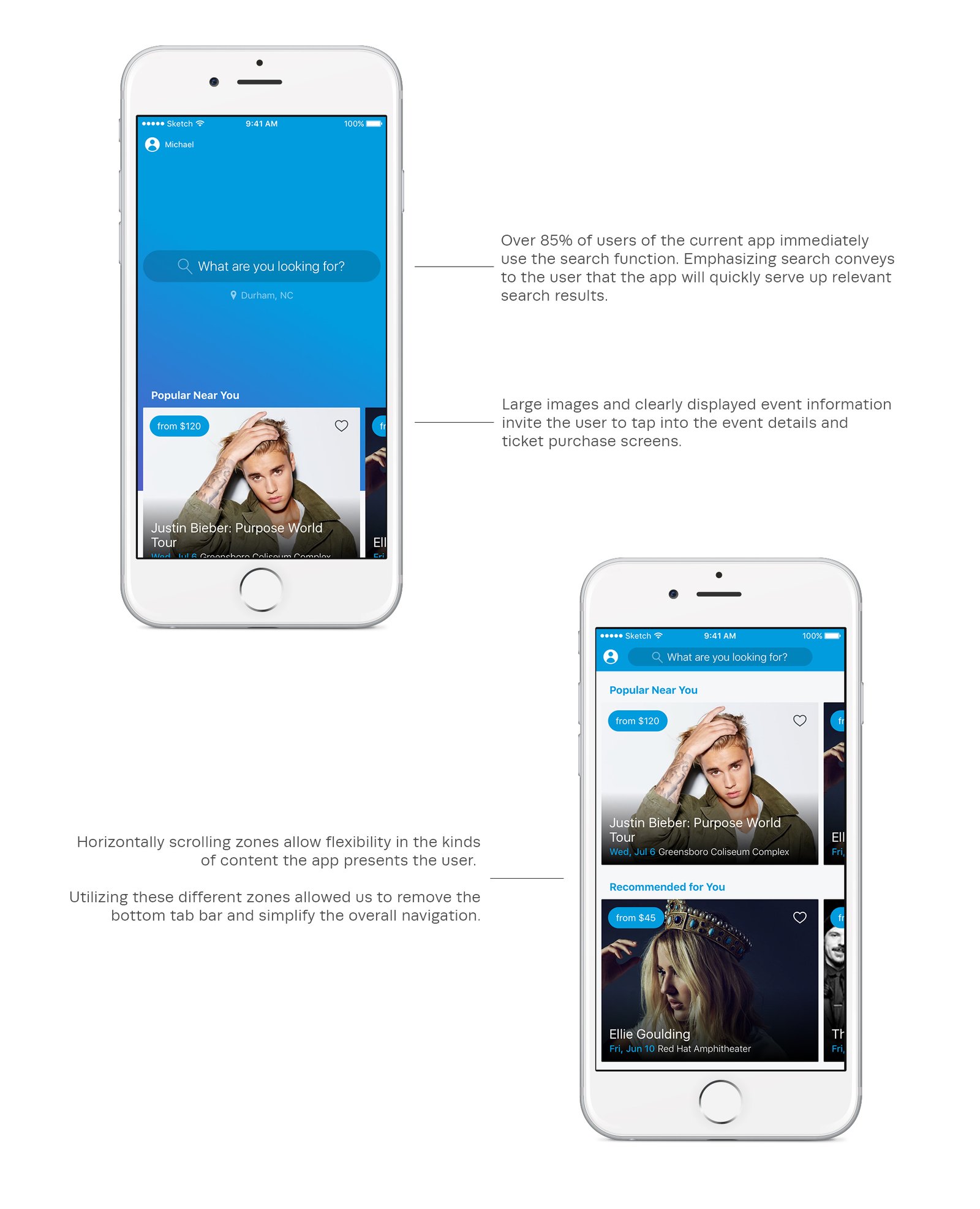 The new design emphasizes search, which is the primary use case for the Ticketmaster app. The new horizontally scrolling zones feature brings a new level of engagement, allowing those who prefer to browse easily find relevant events. This zone framework would enable us to serve up different types of content, such as venue-specific events, favorite artists, or popular nearby events, based on user behavior.